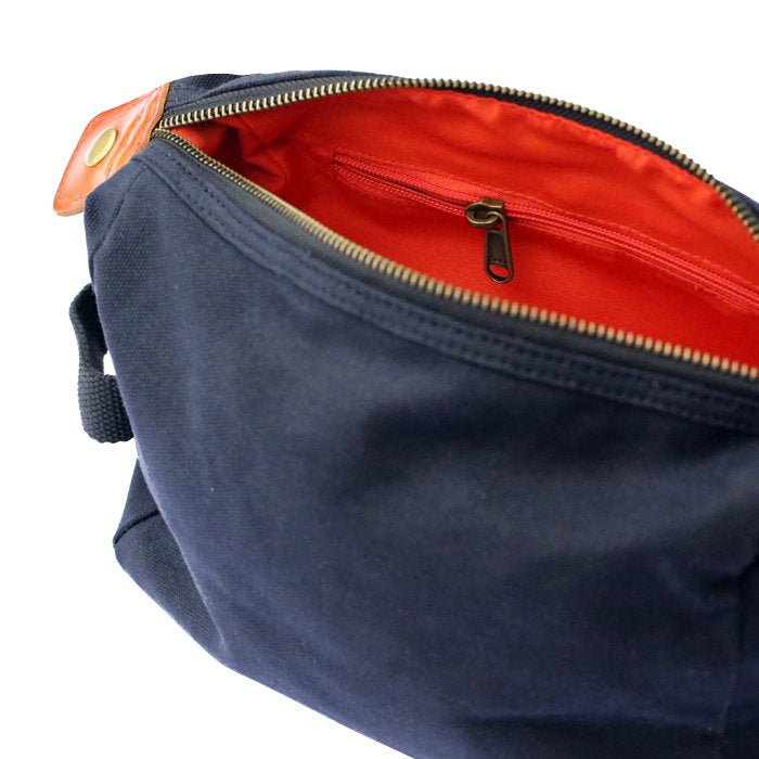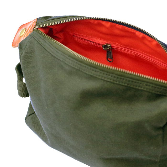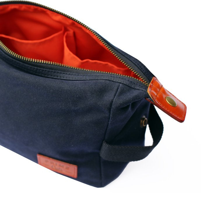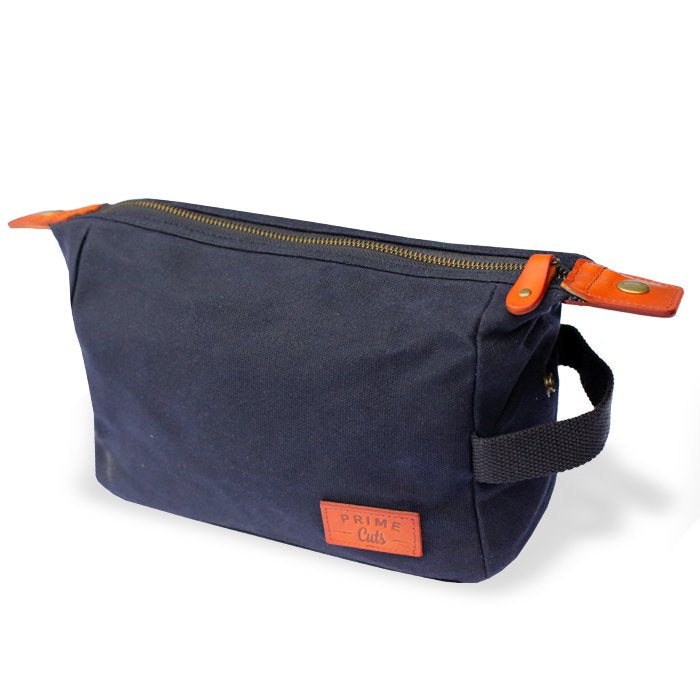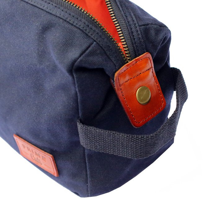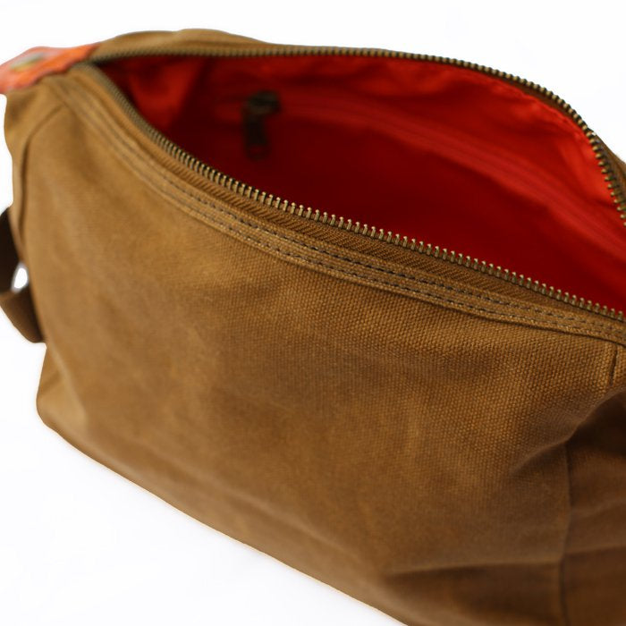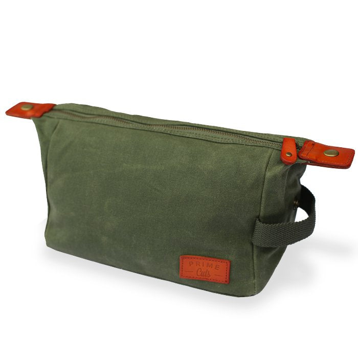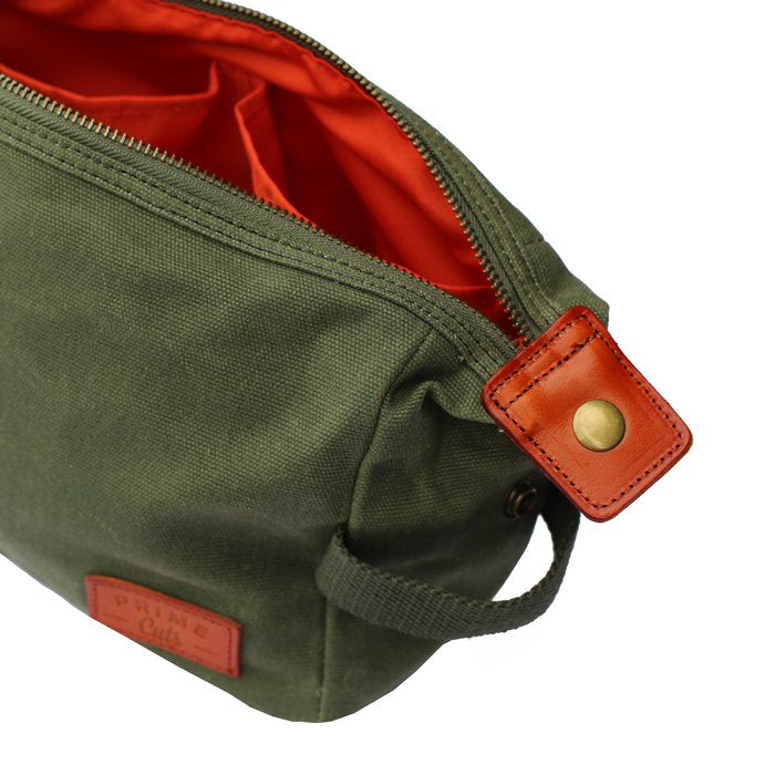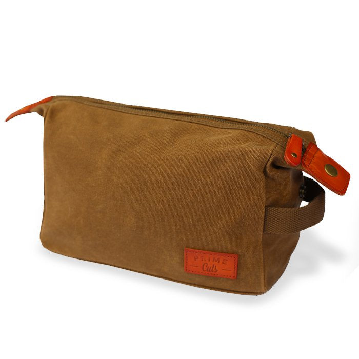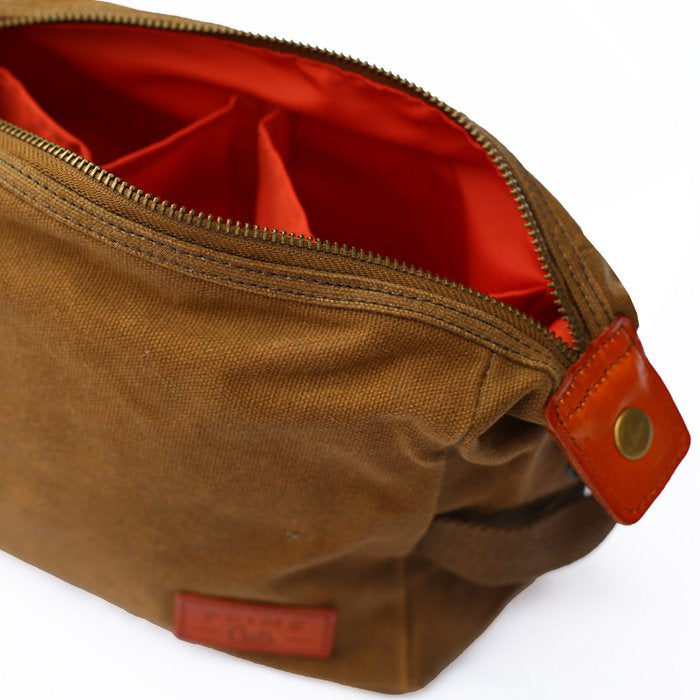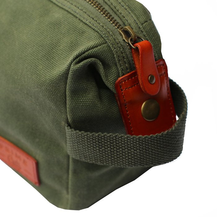 • de toilettas is gemaakt van 16oz gewaxt katoen: een robuuste en hoogwaardige stof die vlekbestendig en waterafstotend is