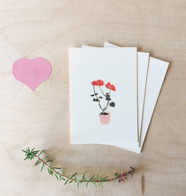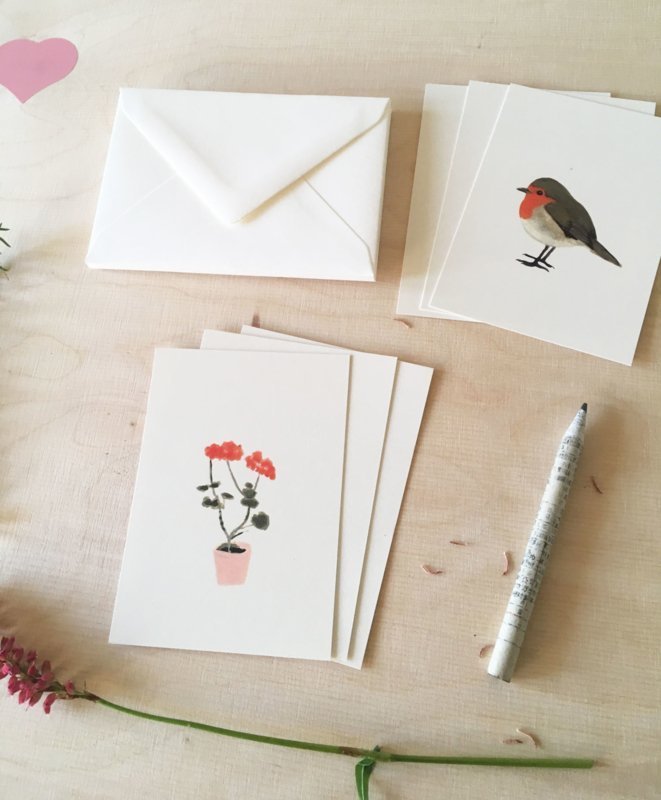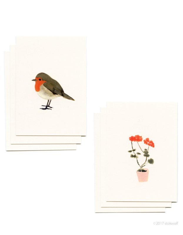 Schrijf met passie, verstuur met liefde deze mini kaartjes met daarop een geranium of of roodborstje van Stokwolf. Met de hand geïllustreerd door Thalysia van Esch.